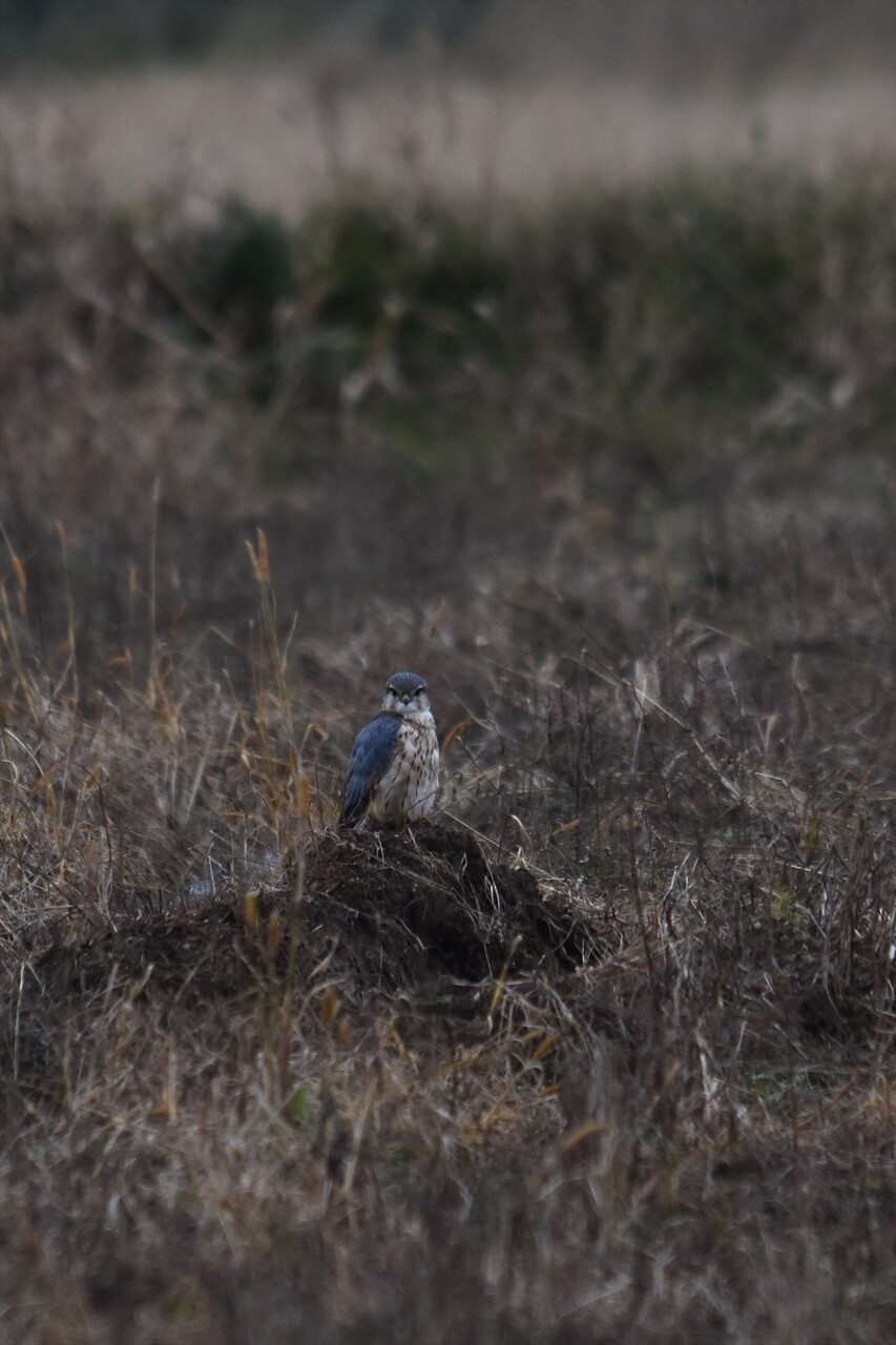 すると荒れ地の土の塊の上に青灰色の鳥がいます!