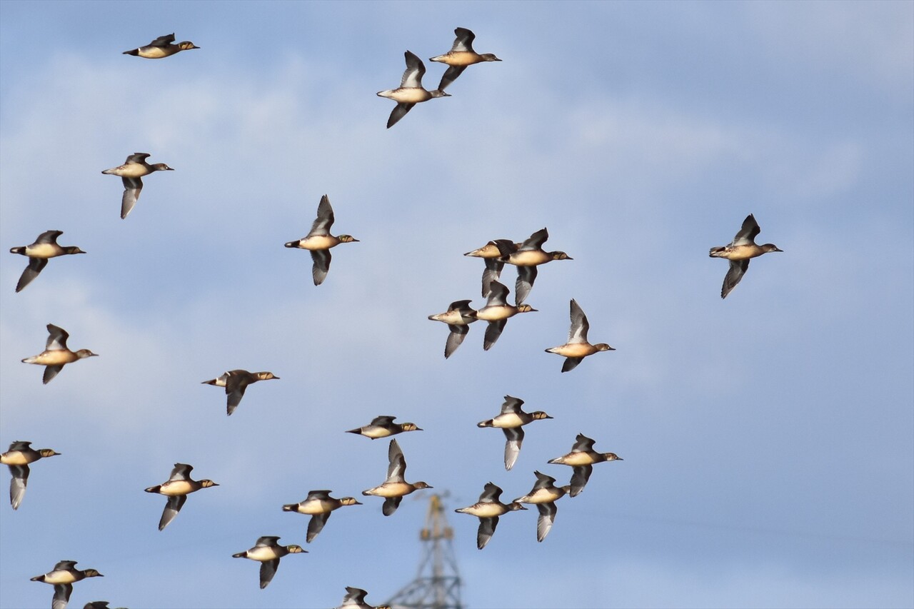 遠くを飛ぶ小さなカモの群れが見えます。